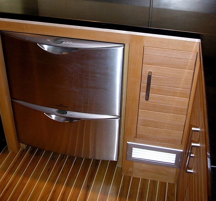 The galley (right) was constructed with space at a premium. However, the result; lacquered beech, polished granite and brushed stainless steel, was equipped with double oven, gas hob, American style fridge freezer and a dishwasher - all in a space approximately 3 metres x 3 metres